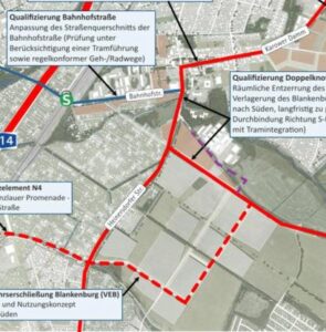 Dies ist notwendig, da in der von der Senatsverwaltung veröffentlichten Überarbeitung des Struktur- und Nutzungskonzeptes überhaupt kein Anschluss der Tram an den S-Bahnhof Blankenburg mehr vorgesehen ist.