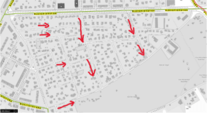 Beispiel, wie mittels der Anordnung von Einbahnstraßen der Durchgangsverkehr verhindert werden könnte. Die Pfeile verdeutlichen die Richtung der Einbahnstraßenführung.