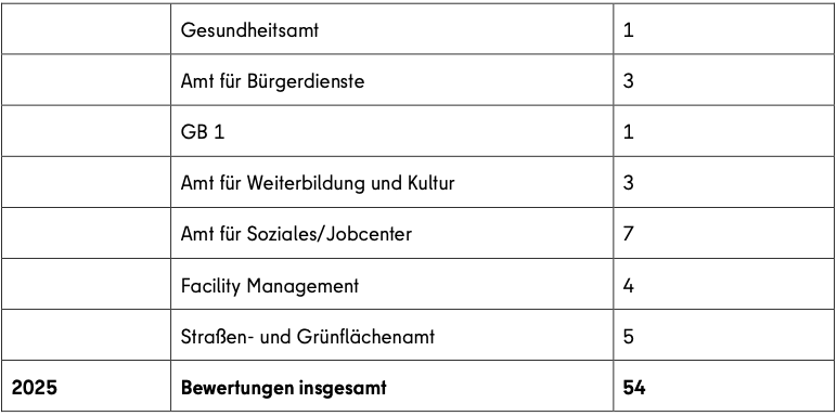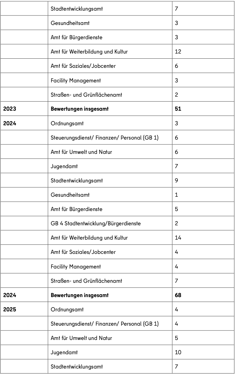 An dieser Stelle ist anzumerken, dass zu einem abschließend bearbeiteten Stellenbewertungsvorgang auch die vollständige Beteiligung der Beschäftigtenvertretungen gehört und somit noch nicht alle in 2025 bearbeiteten Bewertungen mitgezählt werden konnten.