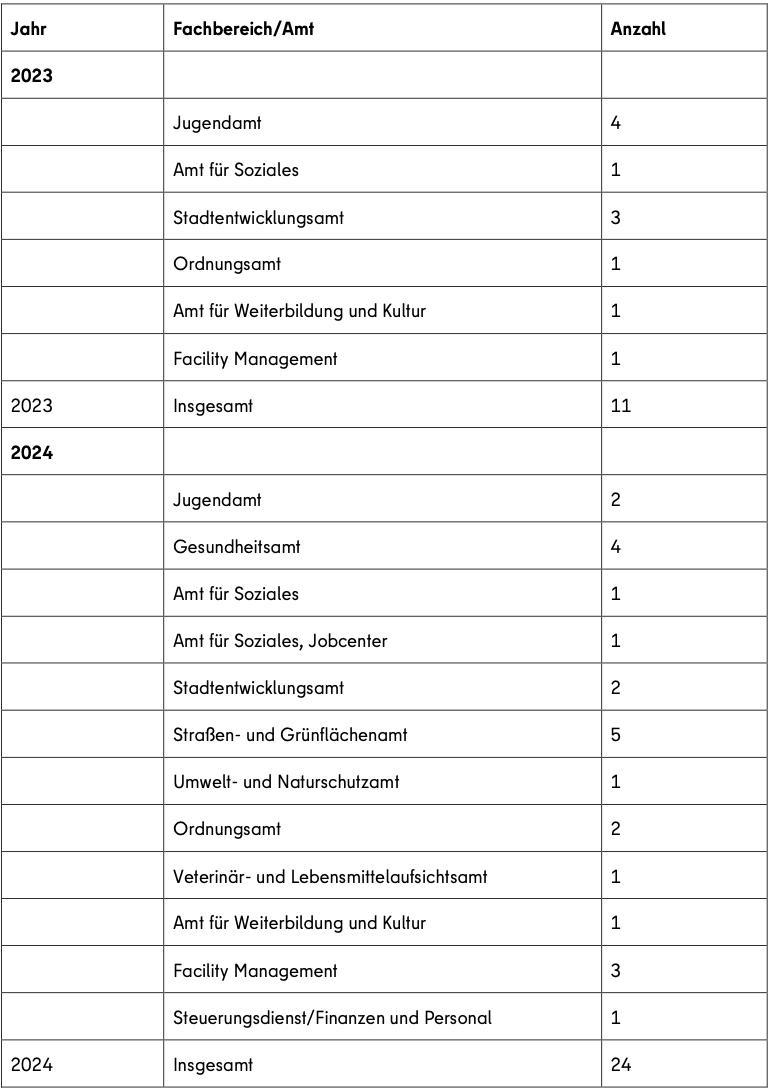 3. Wie viele der unter Frage 1 genannten Verfahren konnten bis zum Stichtag 31.12.2025 abschließend bearbeitet werden? Bitte nach Jahr und Fachbereich/Amt aufschlüsseln.