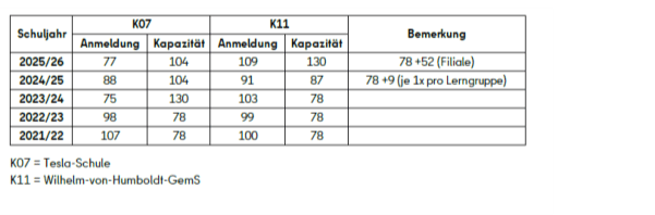 1. Über wie viele Züge/Schulplätze verfügen die Tesla und die Wilhelm-von-Humboldt GemS jeweils in der Primarstufe, SekI und Sek II? Wie viele der Plätze in den jeweiligen Stufen sind im SJ 2025/26 belegt? Wie viele Plätze sind nicht belegt?