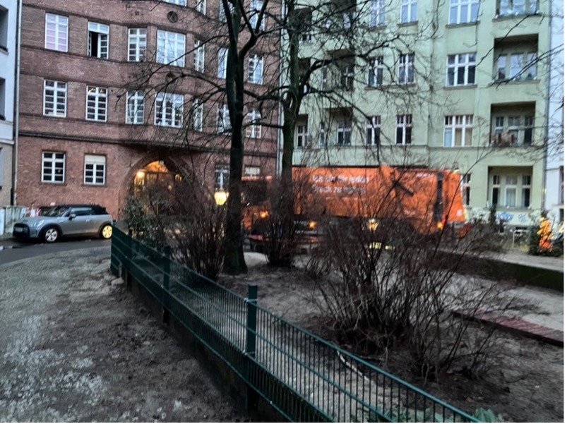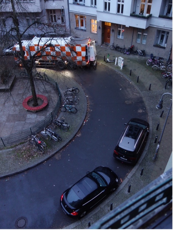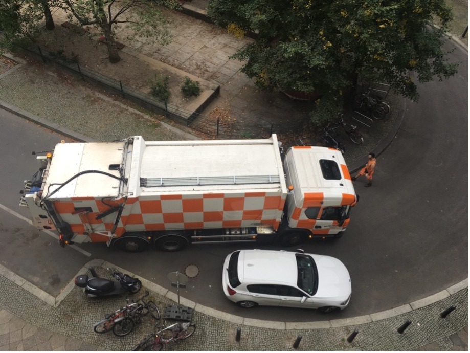 • Die Entsorgungsfahrzeuge behelfen sich z.B. durch teilweise Befahren des den Fahrzeugen gegenüberliegenden Gehwegs oder rückwärts Einfahren in den Wendebogen (siehe Bilder), in der Regel nicht dadurch, dass ein Entfernen der Fahrzeuge durch Ordnungskräfte angeordnet wird.